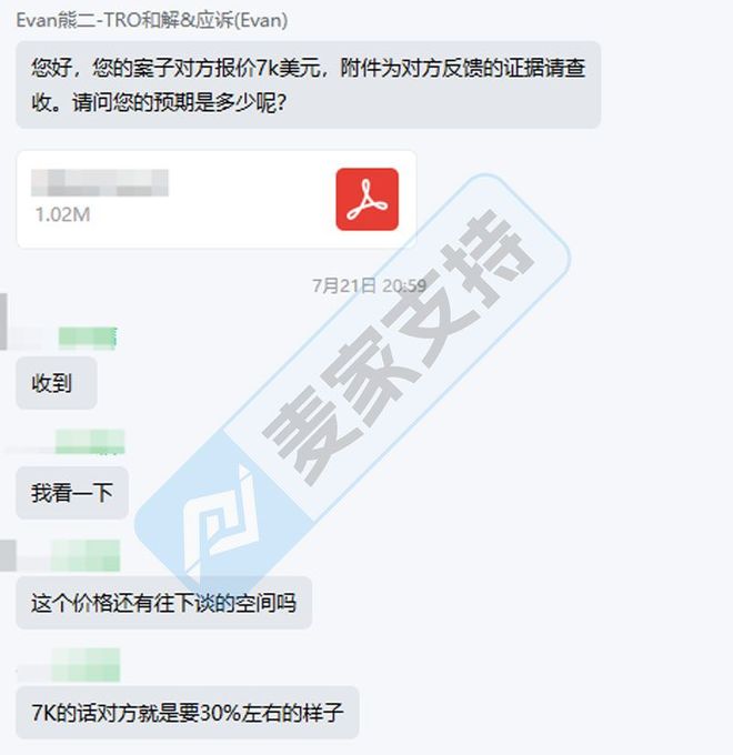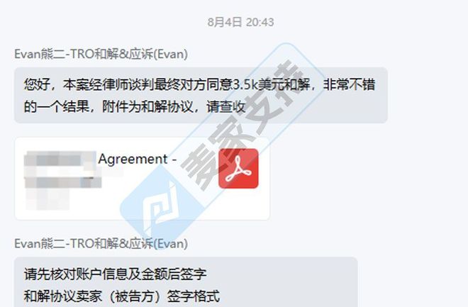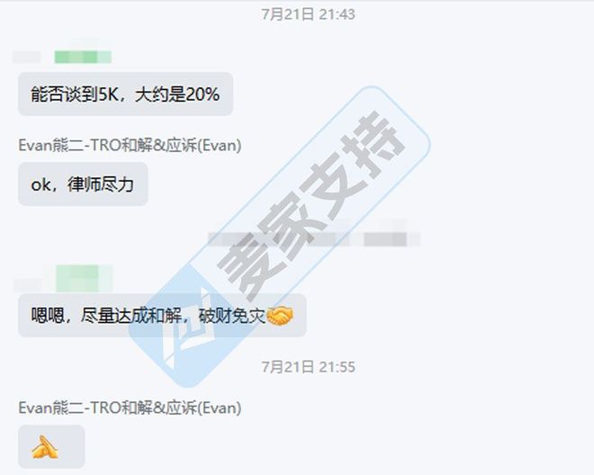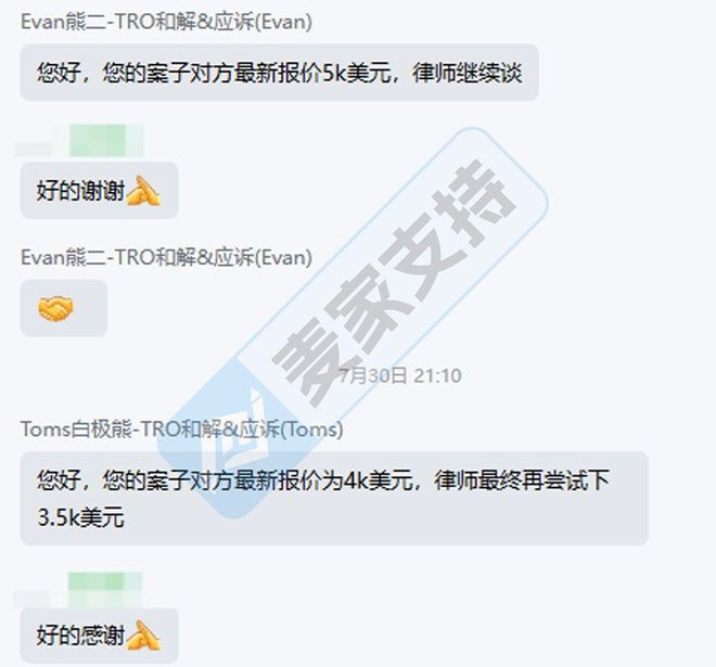 律师接到客户确认委托后迅速跟进并联系原告索取侵权证据,制定后续谈判方案,争取为客户争取利益最大化!经过数轮有效谈判,从最初的7k美元报价再谈到客户预期的5k美元。然而,律师团队并没有满足于此,继续为客户争取更低的和解成本,最终以远低于客户预期的3.5k达成和解,为客户挽回了账户冻结资金的87%,最大限度地减少了损失。