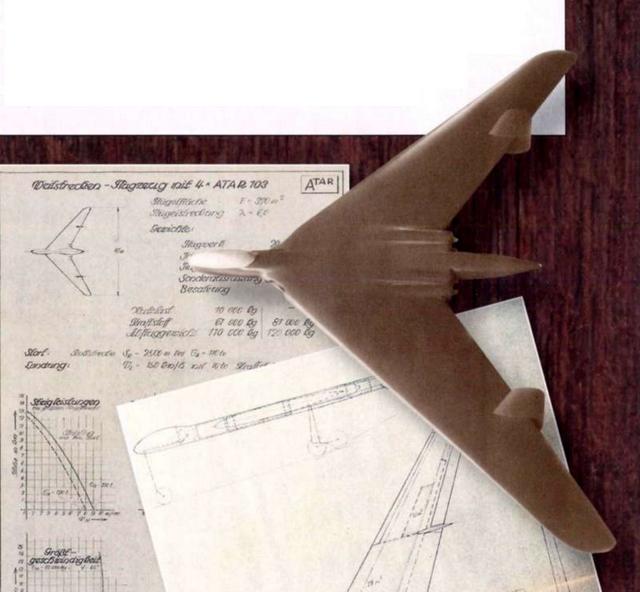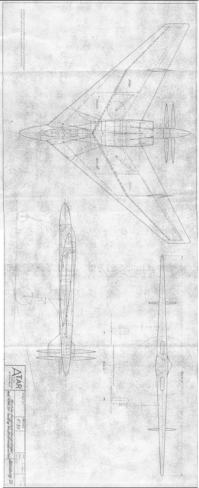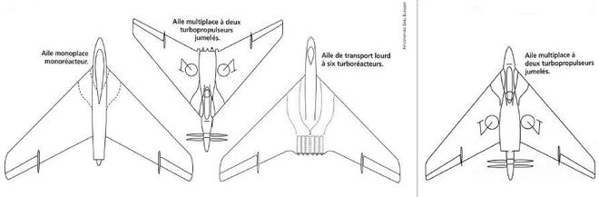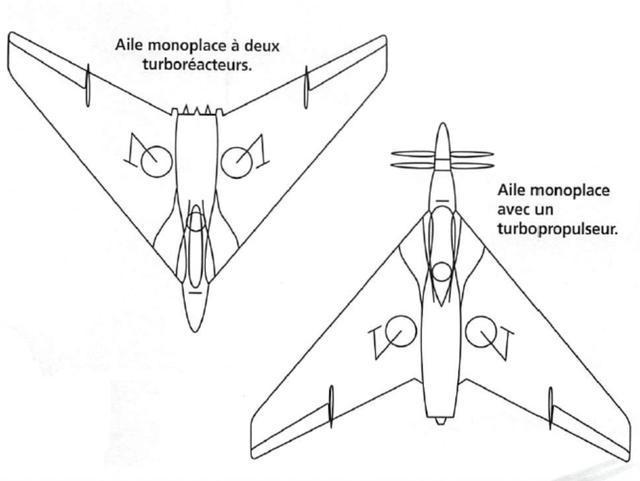 因此另外提出了一个面积为600平方米、配备6台ATAR 103的飞翼飞机具有45米的翼展和180吨的起飞重量,旨在展示飞翼设计结合喷气驱动的未来的大型客机,其巡航速度可达1000公里/小时,航程可达10000公里。在基础形状上,可以实现良好的乘客空间,达80平方米的客舱面积提供90个乘客座位,并且在纯飞翼布局中拥有足够的头部空间。