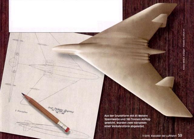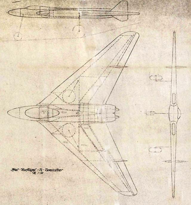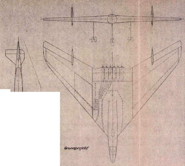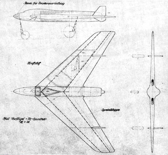这种飞翼的设计似乎受到了1944年12月由亨克尔的赫特尔教授和工程师格罗普勒开发的容克斯 EF 128战斗机项目的影响。根据设计,中央机身后部装配喷气式发动机。通过计算得出,最佳翼面积约为34平方米。有效空间足够容纳所有测试装置,并满足在2公里高度下1小时全油门飞行的燃料需求。但设计同时也预留了1500公斤载荷空间以满足其他用途是可能的。