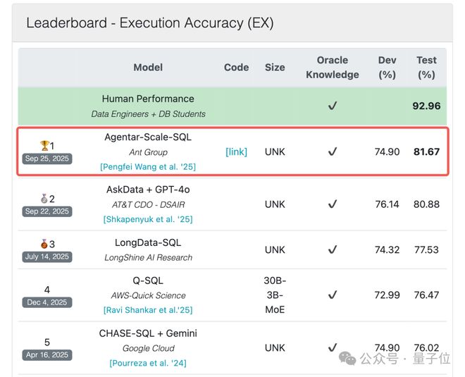 就在今年9月,蚂蚁数科的Agentar-Scale-SQL在BIRD榜单上以执行准确率(81.67%)和执行效率(77%),双料第一的成绩登顶一举超越了谷歌、亚马逊等国际科技巨头。