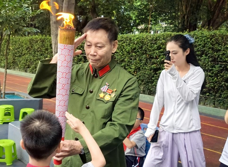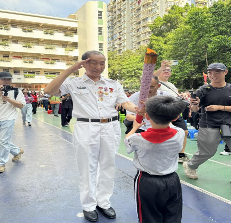 在互动环节,学生们围绕“军营生活是什么样的?”“遇到困难时如何坚持?”等问题踊跃提问,老兵们耐心解答。广州市荔湾区华侨小学汇龙学校还邀请了奥运冠军张洁雯,现场模拟了庄重的火炬传递仪式,奥运冠军、老兵与各年级学生代表共同完成了火炬传递,拉近了彼此间的距离。通过一问一答、亲身示范,红色种子在学生心中悄然发芽,责任感与使命感在互动中逐渐增强。