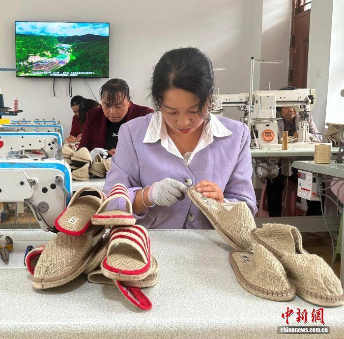 女工赵小琴平日靠做麻鞋贴补家用。她说,做一双麻鞋能挣五块钱,一天下来可以完成十几双。这份计件工作让她在照顾孩子之余,也有了稳定的收入。她对现在的生活,满意极了。