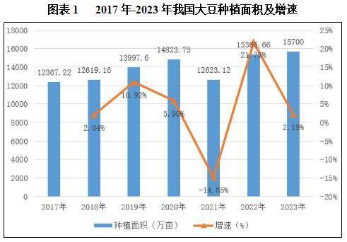 2010~2015年,受农业产业结构调整等综合因素影响,中国大豆产量随种植面积同步呈现波动下降趋势;2016~2020年,在国家粮食安全战略相关政策的引导下,大豆种植面积持续回升,产量也随种植面积同步增长;2021年,由于非洲猪瘟发生以来猪肉价格猛涨带来的生猪养殖业对玉米供给需求的拉动以及玉米价格的上涨,农民对玉米种植的主动性较高,大豆产量再次随种植面积同步下降。而实现大豆增产以及减少对外部来源的依赖一直是政府的重要议程,增加国内大豆产量的紧迫感再次增强,2021年底,“扩大大豆油料生产”成为了中国农业部门2022年必须完成的“重大政治任务”;2022年,中国大豆产量随种植面积再次回升,种植面积达15365.66万亩,同比增长了21.73%;2023年我国大豆种植面积达15700万亩,同比增长2.18%。
