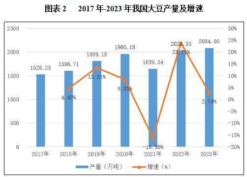 从大豆产量来看,2017-2020年我国大豆产量快速增长。2021年我国大豆产量受种植面积减小的影响,出现明显下滑,低于2019年水平,数据显示,2021年我国全年大豆产量为1639.54万吨,同比下降16.36%。2022年我国大豆产量高达2028.35万吨,同比增长23.71%。2023年我国大豆产量高达2084.00万吨,同比增长2.74%。